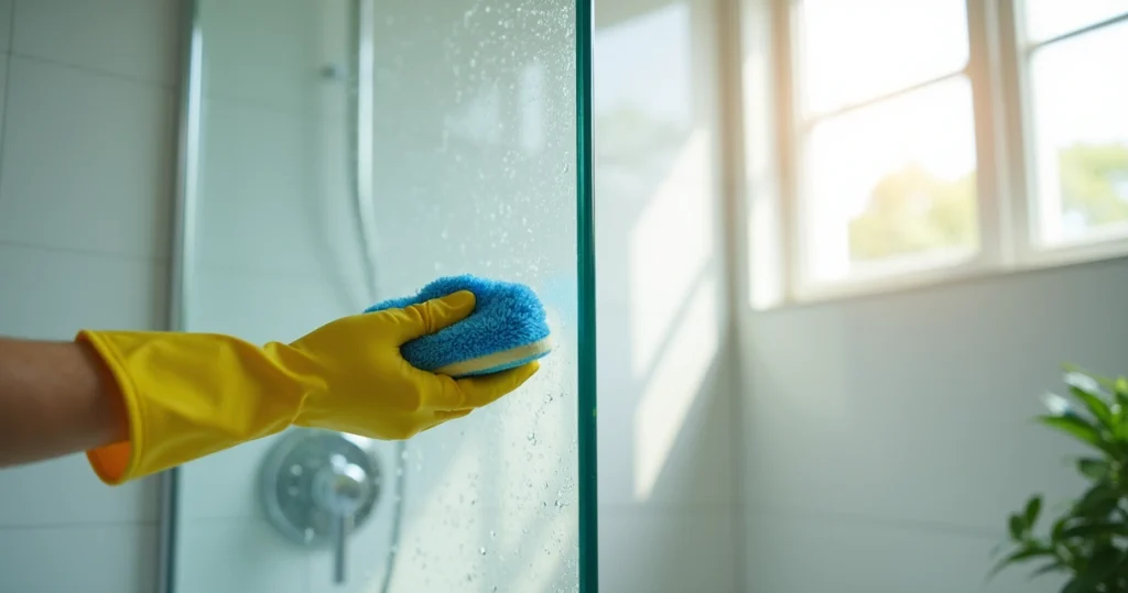 - Usa una esponja o paño para frotar suavemente paredes y mampara.